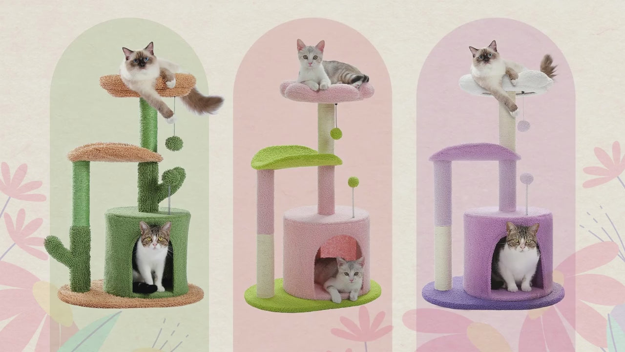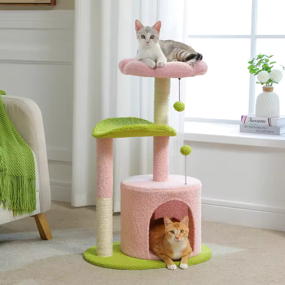 This flower-themed cat tower blends aesthetic appeal with multi-functionality. With its whimsical floral motif and space-saving structure, it offers three dedicated zones for your cat to play, relax, and scratch. Outfitted with 2 plush-covered sisal posts, a comfy condo, cushioned perches, and fluffy dangling toys—this tree keeps your feline engaged all day long.