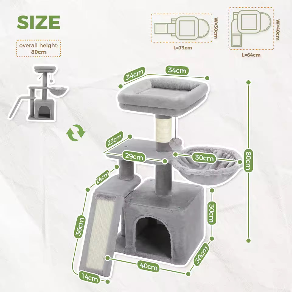 This compact cat tree is perfect for multiple cats to enjoy together. The large, soft cat condo offers your kitten a cozy private retreat, while the deep hammock becomes a favorite spot for curling up. Plus, the top perch gives your cats a panoramic vantage point to observe their surroundings.