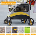 Large pet stroller with 4 EVA 360 degree swivel wheels, sturdy and durable, front 2 wheels shock absorption for pushing smooth even on roughest terrain, 2 rear wheels with pedal brakes to keep pets in safety, Easy to maneuver and suitable for any kinds of road, and you can buy rain cover for this stoller in our store