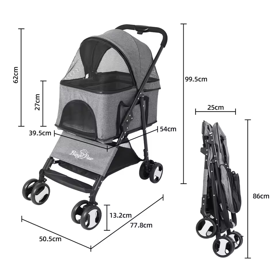 The innovative folding mechanism makes storing and transporting the pet stroller a breeze. After a pleasant walk or trip, it can be easily collapsed for space-saving storage.