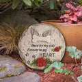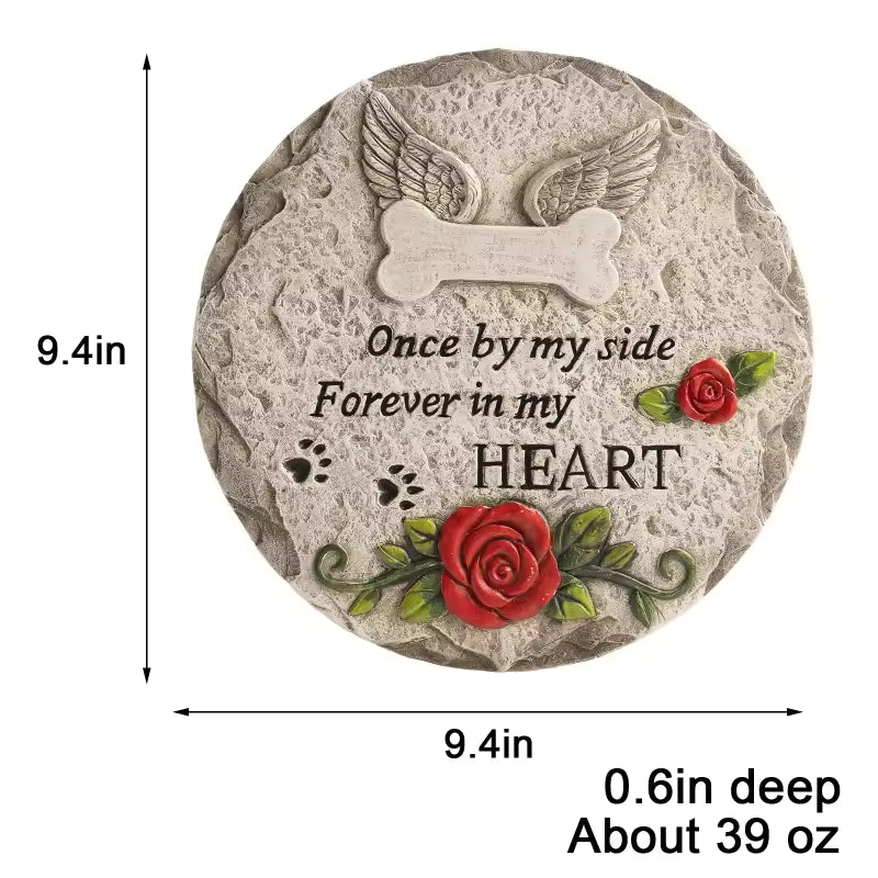 Honor the memory of your beloved pet with this beautifully designed memorial stone. Featuring heartfelt elements like bones, footprints, and lovely flowers, the inscription "Once by my side, forever in my heart" speaks to the eternal bond shared between you and your furry friend. This stone provides comfort and peace to those grieving the loss of a dog or cat.