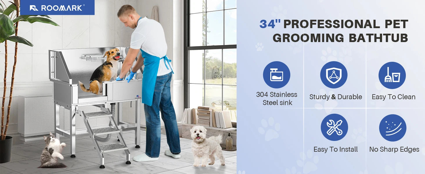 ROOMARK 34" Canine Washing Station Stainless Steel Pet Grooming Tub with Sliding Door, Faucet Attachments, Dog Bath Tub for Medium-Sized Pets