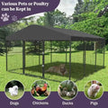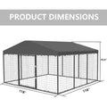 This extra-large outdoor dog kennel measures 118" W x 118" D x 70" H, offering a generous play and exercise area for dogs of all sizes. Its spacious design comfortably accommodates multiple large dogs at once, creating a secure and comfortable outdoor space for your pets to roam, play, and relax freely.