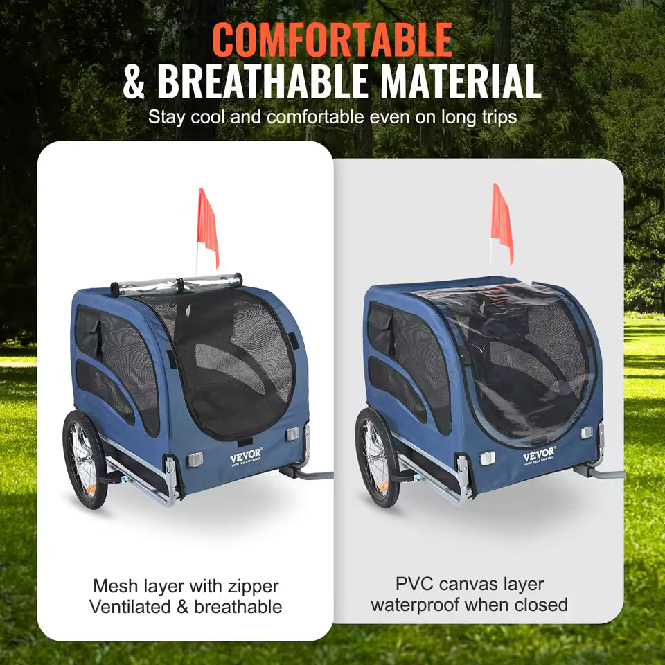 Convenient Entry and Airflow:The clear front door of the trailer is designed for weather protection and incorporates a four-sided mesh layout for optimal ventilation. Your pet can easily access the trailer through both the zippered front and rear entrances.