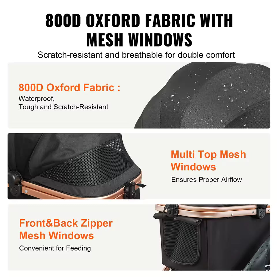 Breathable and Comfortable:Featuring multiple mesh windows, the stroller provides your pet with a broader view and closer interaction with the environment. The durable 800D Oxford fabric ensures the stroller endures playtime while maintaining safety and comfort.