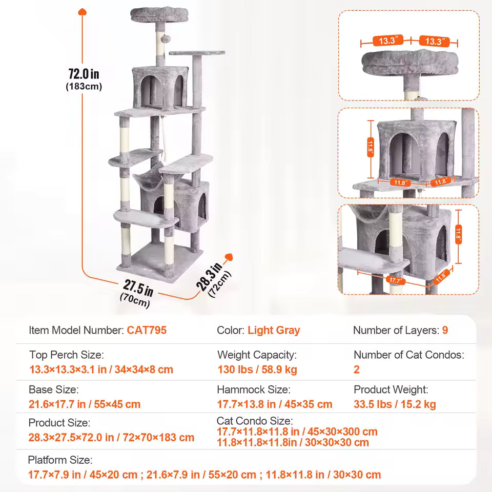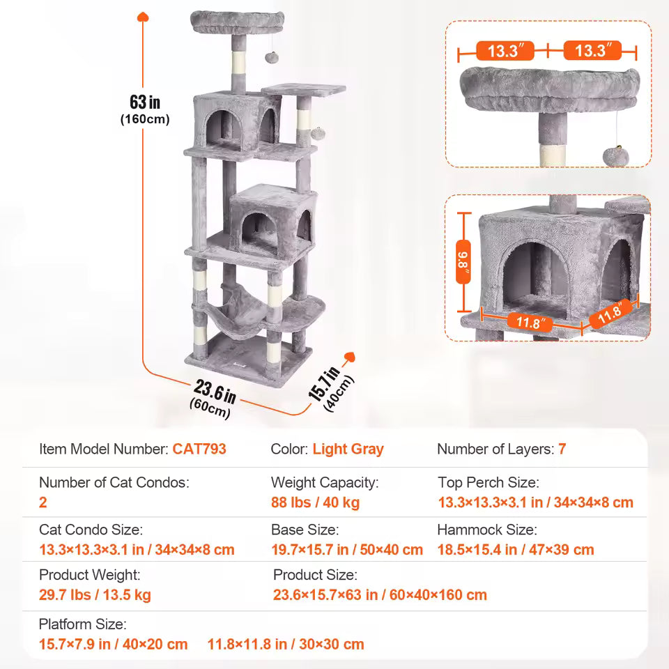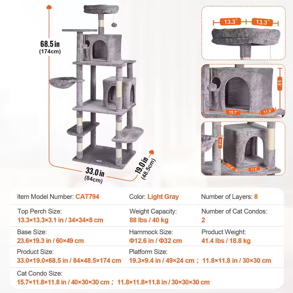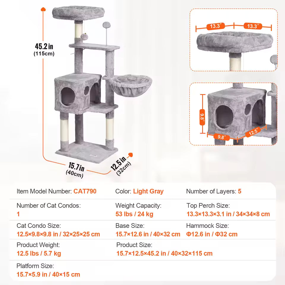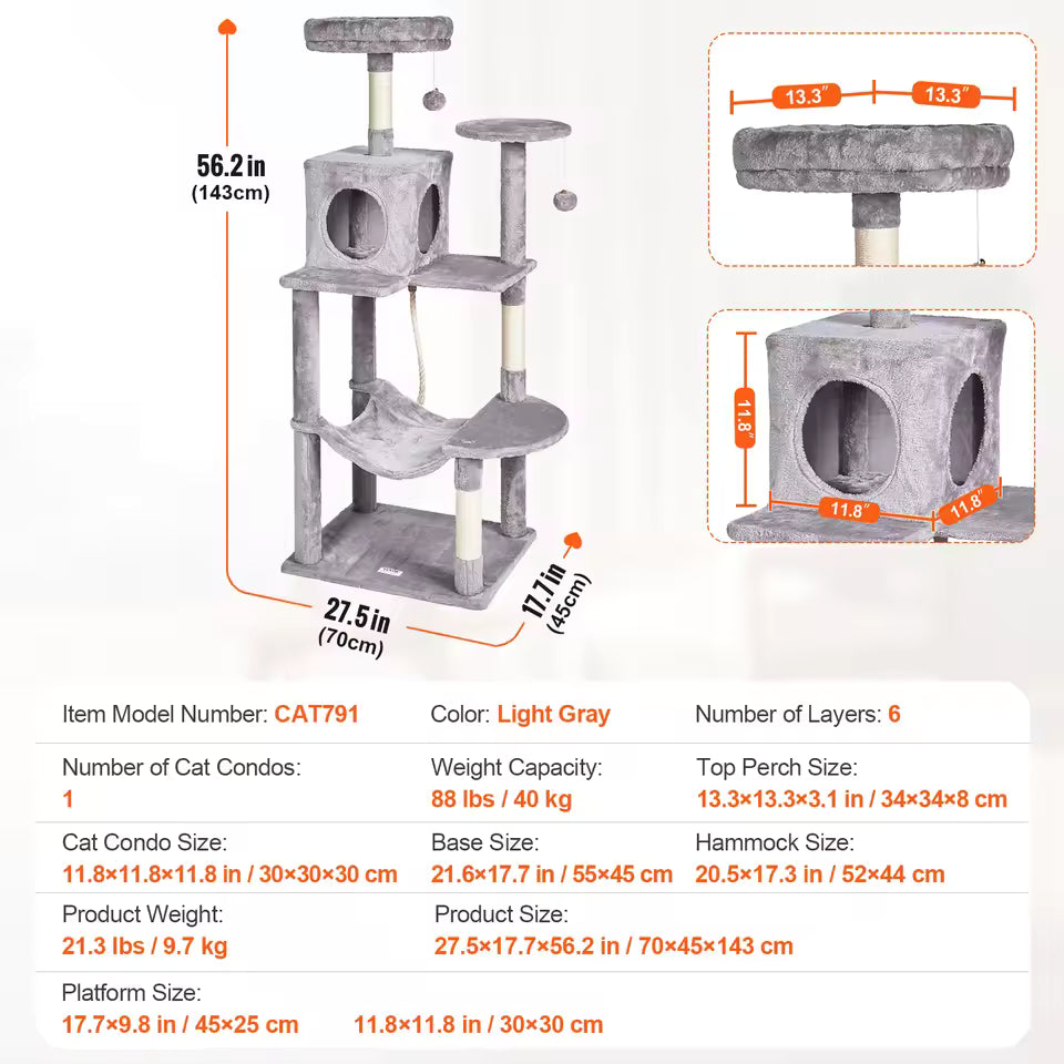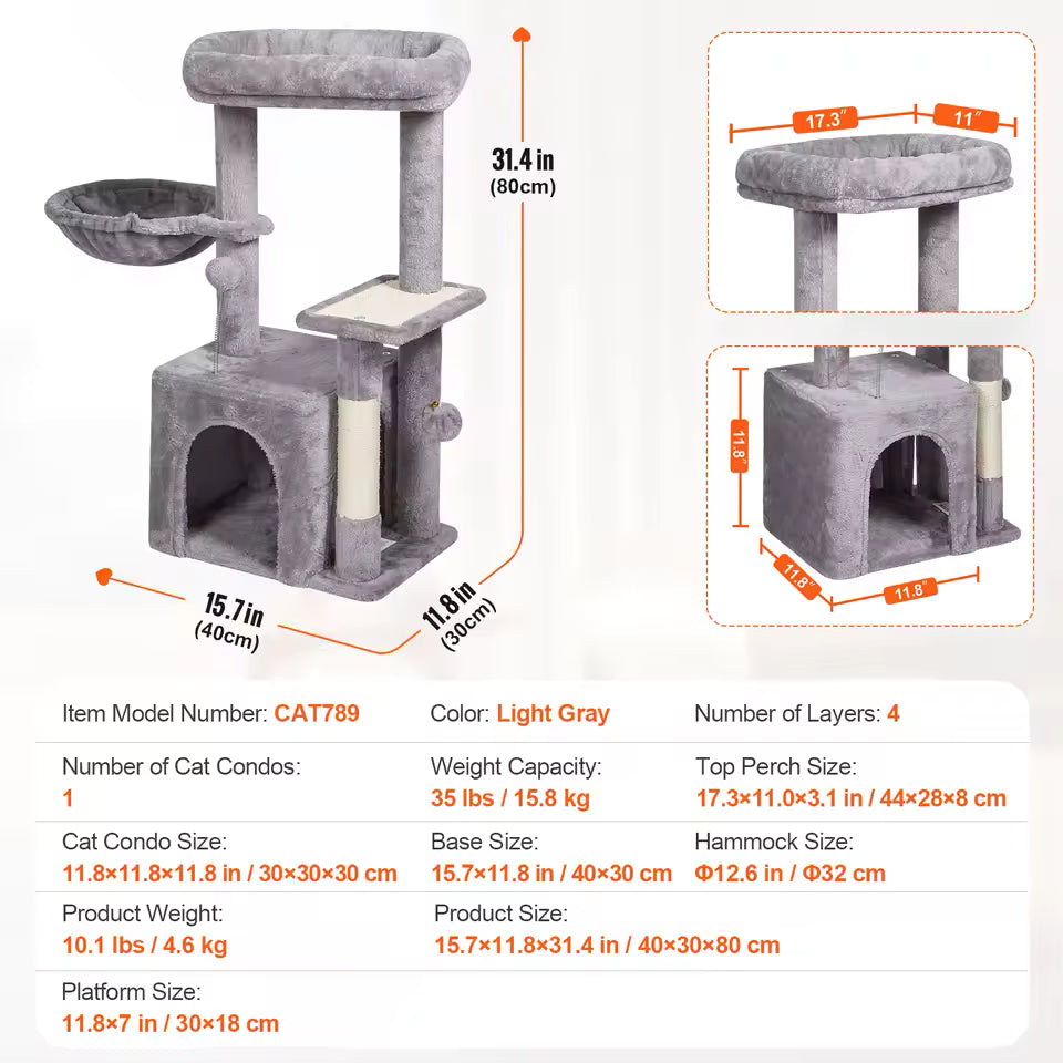 Let cats enjoy a comfortable and secure environment on this cat tower. With four different resting areas including a spacious base, cozy hammock, hidden cat condo, and soft top perch for cats to lounge, hide, or perch high.