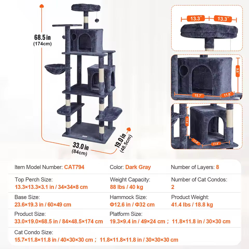 SucceBuy Indoor Cat Tree Tower β Multi-Level Condo with Hammock, Sisal Scratching Posts, and Perch β Dark Grey